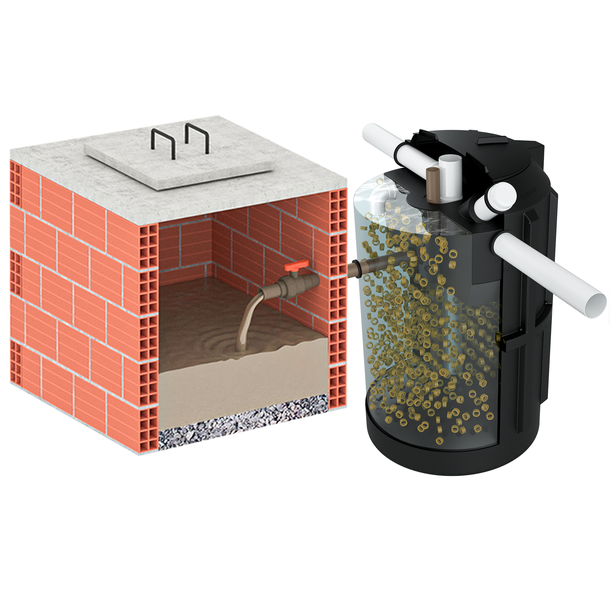 – Sistema 3 em 1: Reator, Filtro anaeróbio e Sistema de cloração.
